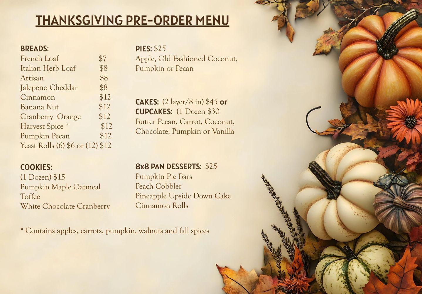 *Note: Please order at least 48 hours in advance. Food Allergy Warning: Please be advised that food prepared in our kitchen may have come in contact with or contain nuts, milk, eggs, wheat and/or cinnamon. Please inform me of any allergies so that every effort can be made to reduce exposure to allergens.
